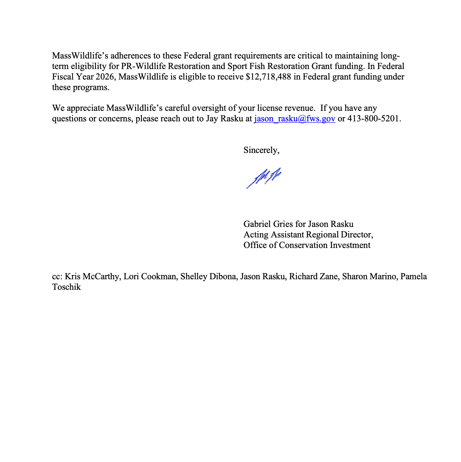 See letter from U.S. Fish and Wildlife Service below.