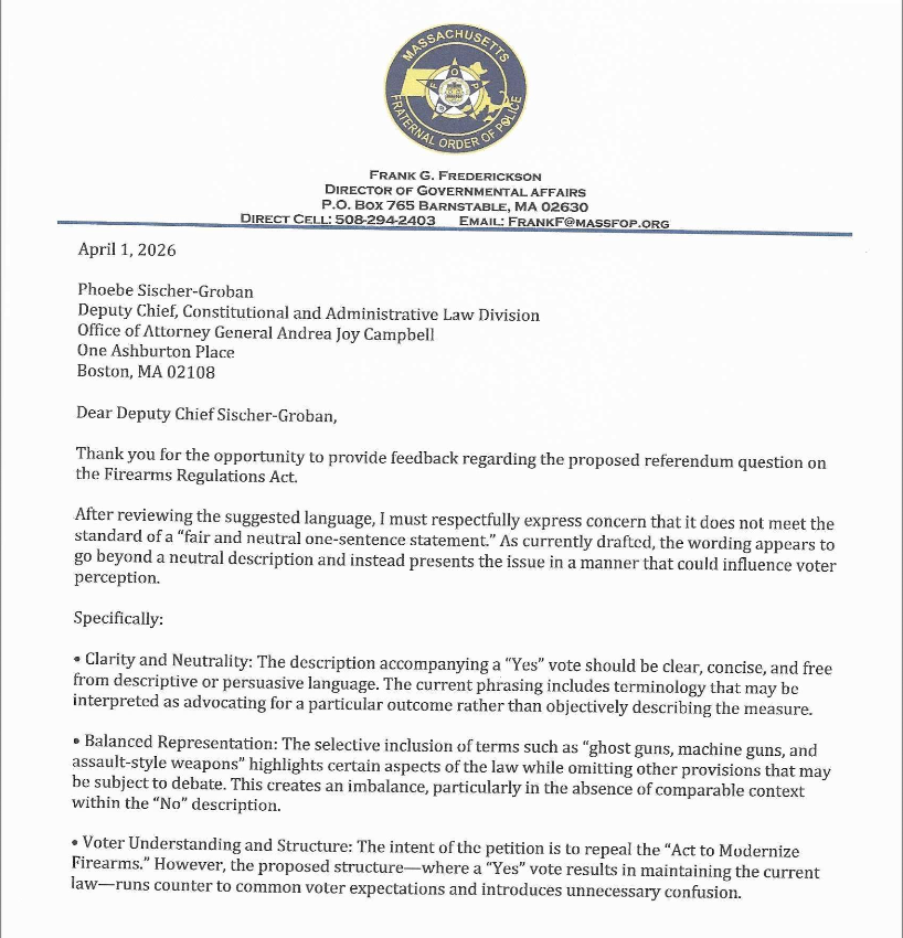 Like the response from GOAL, the MassFOP’s letter includes objections to the lack of “clarity and neutrality” in the question expressing their opposition to the use of “persuasive language.” The letter also opposes the “selective inclusion” of such terms as “ghost guns, machine guns, and assault-style weapons” which create an “imbalance…in the absence of comparable context within the “No” description.” GOAL agrees completely with these assessments.