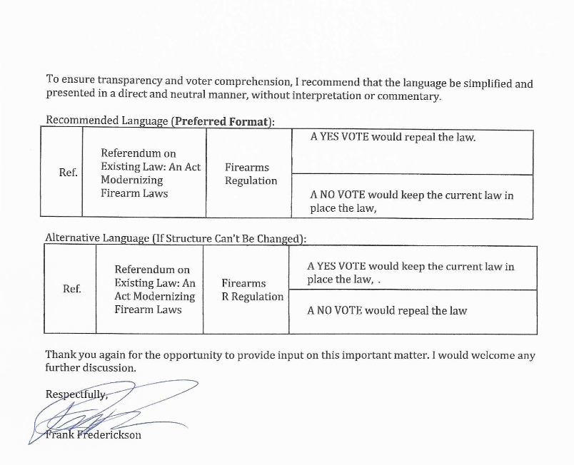The letter goes on to recommend two alternative formats for the law, one would reverse the question making “a yes vote…repeal the law” and “a no vote…keep the current law in place…” The other would just simplify the question (in line with GOAL’s recommendation) if the structure cannot be changed making “ a yes vote…keep the current law in place…” and “a no vote…repeal the law.” Again, GOAL completely agrees with these assessments.