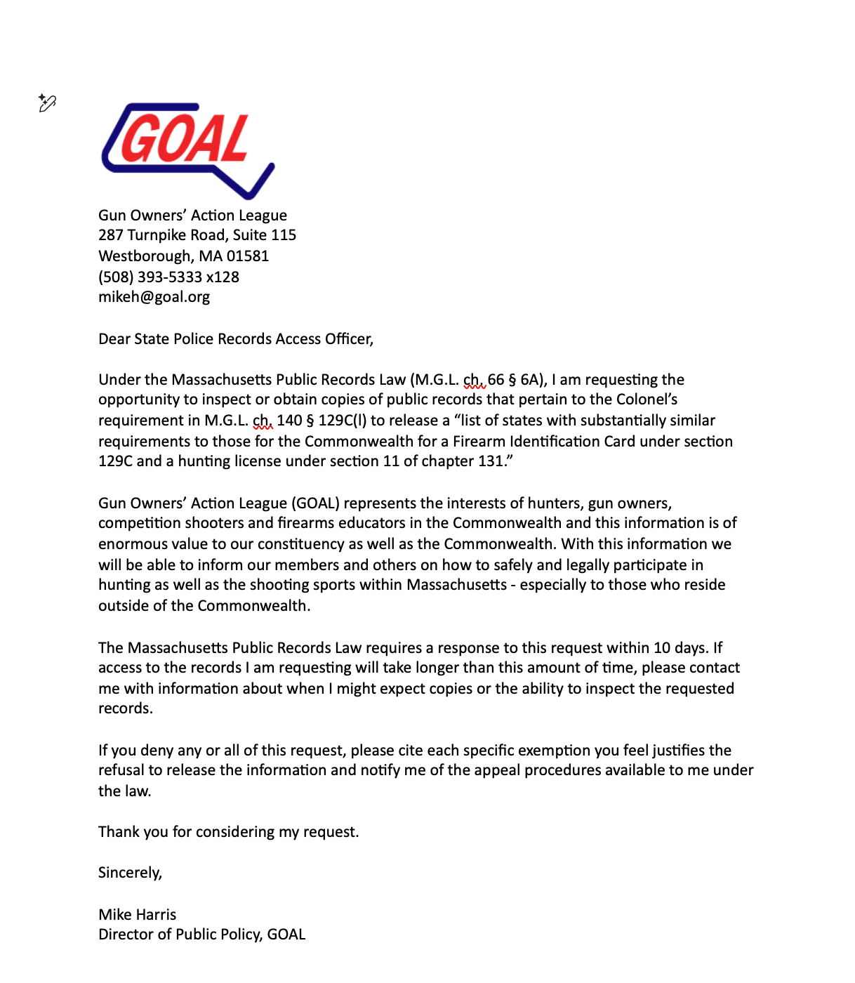 GOAL FILES PUBLIC RECORD REQUEST WITH STATE POLICE