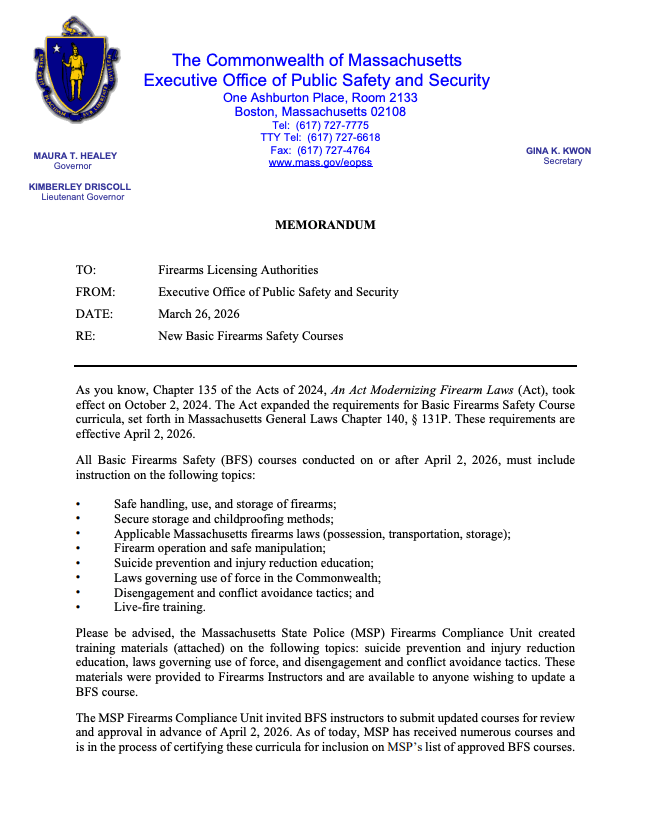 On March 26, 2026 the Executive Office of Public Safety and Security (EOPSS) sent a memorandum concerning the state’s new training requirements:
