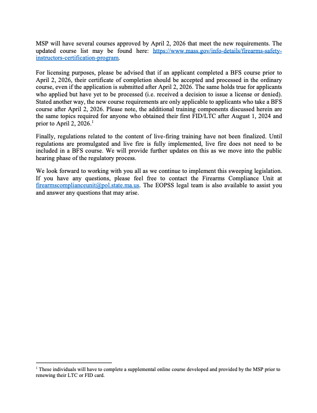 - Mass State Police will have several courses approved by April 2, 2026 that meet the new requirements. The updated course list may be found here: https://www.mass.gov/info-details/firearms-safetyinstructors-certification-program .